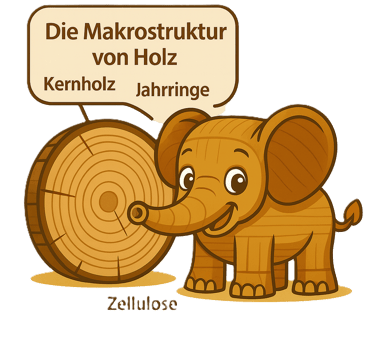 Diese Eigenheiten erschweren die Verarbeitbarkeit des natürlich gewachsenen Holzes, und sie sind im Zusammenhang mit den Feuchteänderungen im Holzgefüge bestimmend für die Anwendung des Werkstoffes. Das dem Auge sichtbare Gefüge des Holzes, der makroskopische Aufbau, ist für jede Baumart charakteristisch und weist oft bei den Hölzern der gleichen Baumart wieder viele Varietäten auf. Da sich der Baumstamm aus den jährlichen Zuwachszonen - den Jahrringen - zusammensetzt, ergeben sich entsprechend der Schnittachse ganz verschiedene Ansichten der Holzstruktur, Textur genannt.