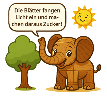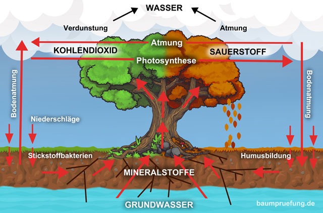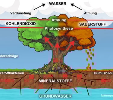 5. Aus den OH-Gruppen bildet sich Wasser unter Freiwerden von Sauerstoff, der von der Zelle ausgeschieden wird. Der Gesamtvorgang kann durch folgende Gleichung ausgedrückt werden: 6 mol CO2 + 12 mol H2O + Energie (675 kcal) Þ 1 mol C6H12O6 + 6 mol O2 + 6 mol H2O. Ebenso, wie der Kohlenstoff nicht direkt in den pflanzlichen Körper eingebaut, sondern in pflanzeneigene Substanzen umgewandelt wird, werden auch die Elemente der Nährsalze wie Stickstoff, Schwefel und Phosphor in Form von Ionen aufgenommen und assimiliert. Dabei ist die Stickstoffassimilation von großer Bedeutung, da die wichtigen Eiweißstoffe Stickstoffverbindungen sind. Diese Produkte werden ebenfalls hauptsächlich in den Blättern gebildet und dienen dem Baum als Betriebsstoffe, Baustoffe und Wirkstoffe (Bio-Katalysatoren). Die Zucker gelten als wichtigste Assimilationsprodukte. Sie sind die Ausgangsstoffe für die meisten organischen Kohlenstoffverbindungen (Stärke, Zellulose) und dienen im Baumstoffwechsel als Energielieferer. Da die Assimilate von den Blättern an die Orte des Wachstums und der Speicherung transportiert werden müssen, ist ihre Wandlung in eine gelöste Form notwendig. Dies wird durch Enzyme (Fermente) bewirkt. Der Transport der gelösten organischen Verbindungen erfolgt auf längeren Strecken in den Siebröhren und Gefäßen, auf kürzeren Strecken durch die Tüpfel oder durch Diffusion.